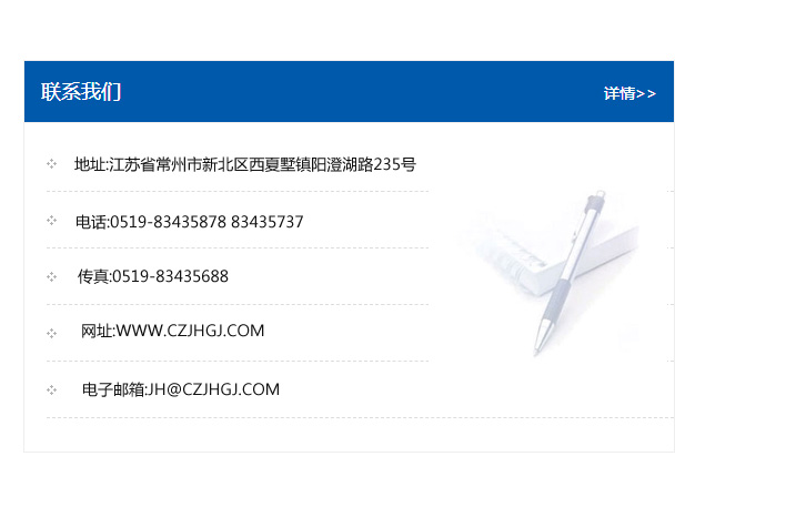 地址:常州市新北區(qū)友邦商務(wù)大廈1幢16、17層  電話:0519-85101652  傳真:0519-85112595  郵編:213022  網(wǎng)址:www_cz-jiayue_cn.jinbeisheying.com  郵箱:xiajifengaa@163.com
